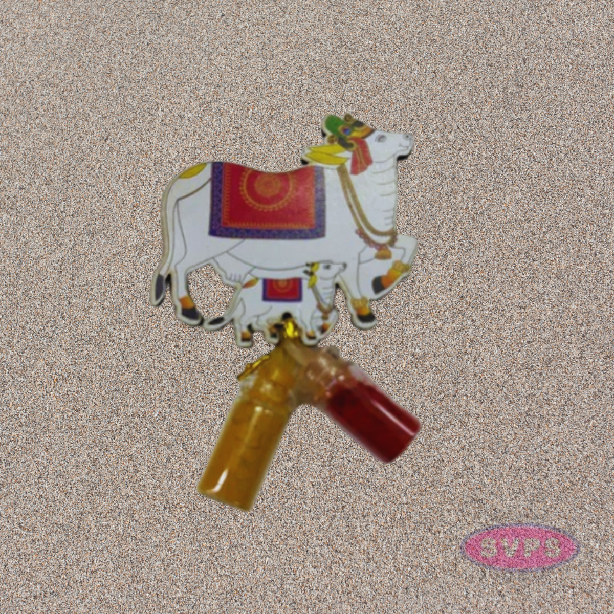 Kamadhenu Cow Fridge Magnet with Mini Kumkum & Haldi Bottles