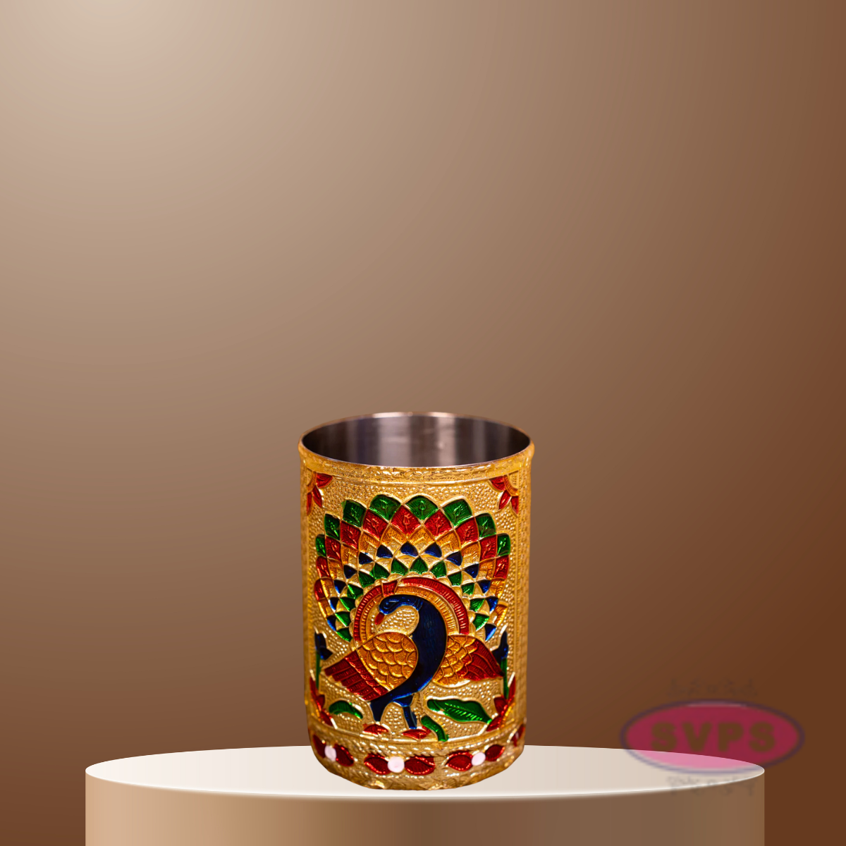 The Meenakari Design Steel Glass is a stunning blend of traditional artistry and modern functionality. With a height of 4 inches and a length and width of 2 inches, this glass is perfectly sized for everyday use.