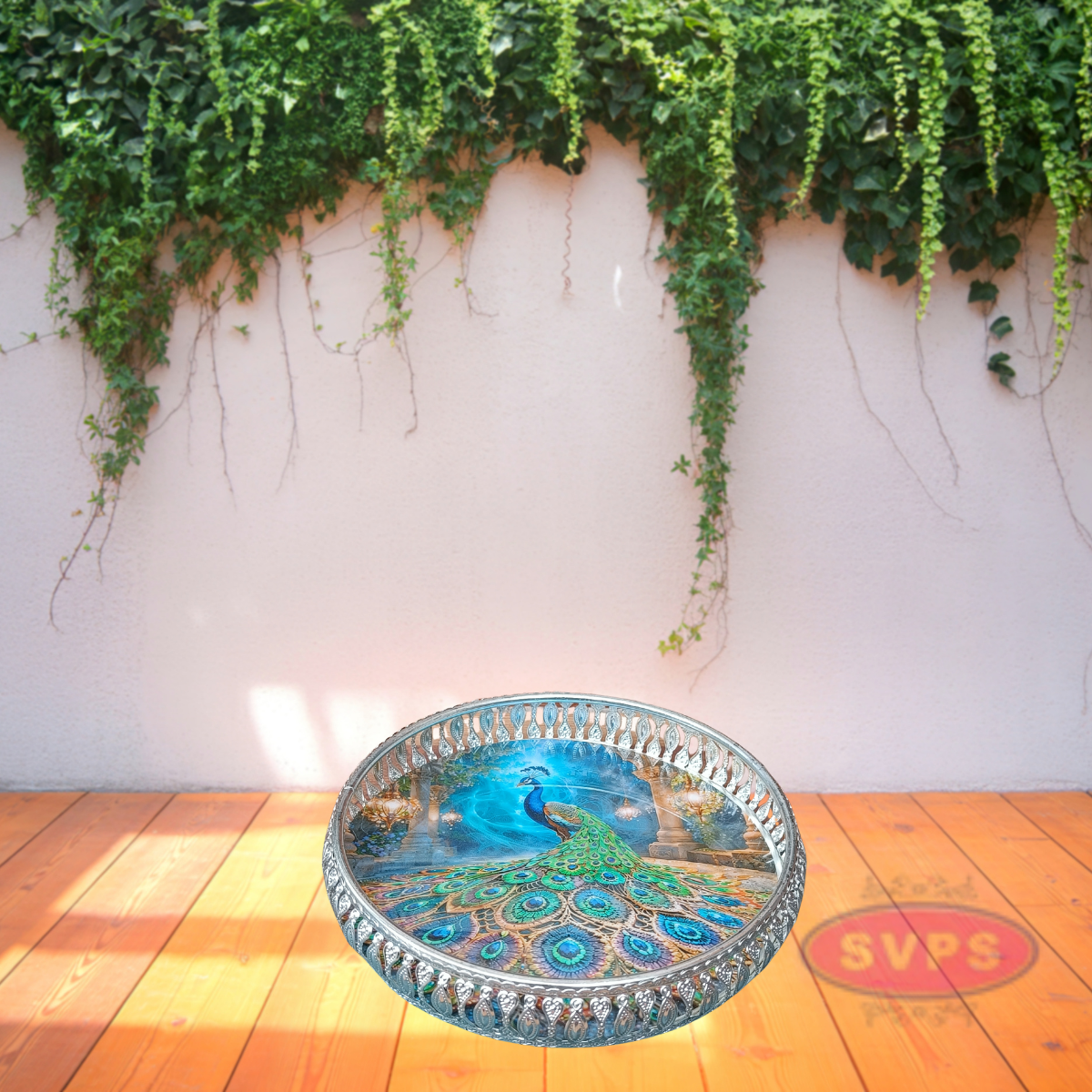 Silver Colored Metal Pichwai Round Tray With Peacock Design