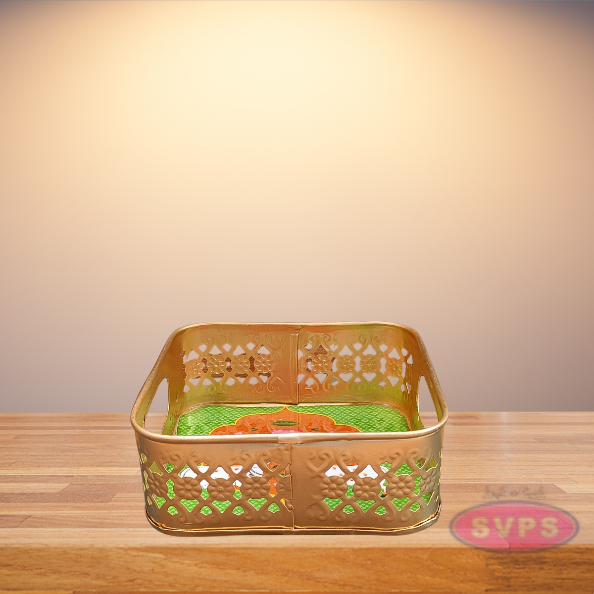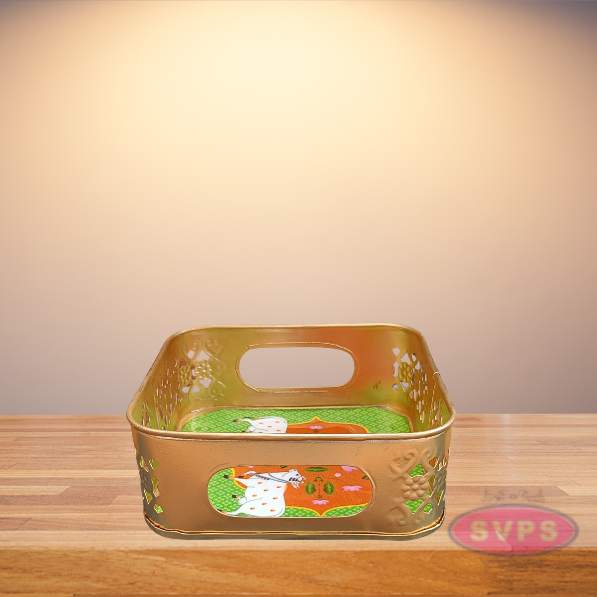 Gold Colored Metal Pichwai Square Shaped Cow Design Serving Tray